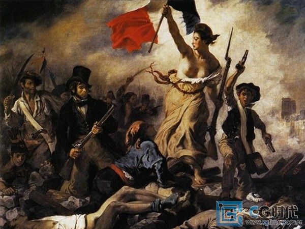 反映1830年革命的《自由引导人民》是德拉克罗瓦(Eugène Delacroix)最具有浪漫主义色彩的作品之一。画家以奔放的热情歌颂了这次工人、小资产阶级和知识分子参加的革命运动。一位象征自由的女神头戴法国大革命时期的红色弗吉里亚帽、左手握枪、右手高举着迎风飘扬的三色旗。她是全画的中心,观众注目的焦点。